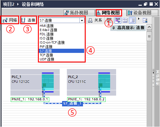 注意: 网络视图的以太网连接中虽然有多种连接选项,但对于 S7-1200 PLC V4.4 及其之前只能在此创建 S7 或 HMI 连接。从 V4.5 开始 TCP、UDP、ISO-on-TCP 可以在此创建连接,方法参见链接。