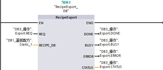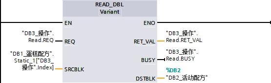 SRCBLK和DSTBLK的实参都是UDT类型,可以使用READ_DBL指令,是将“DB1_蛋糕配方”.Static_1["DB3_操作".Index]也就是配方中的一组读取到活动配方中。