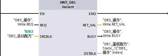 SRCBLK和DSTBLK的实参都是UDT类型,可以使用WRIT_DBL指令,是将活动配方写入到“DB1_蛋糕配方”.Static_1["DB3_操作".Index]也就是配方中的一组中。