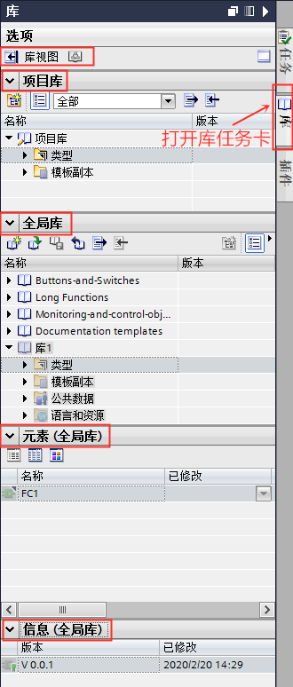 打开 TIA Portal 软件,进入项目视图,在软件的右侧任务卡处单击库,如图 1 所示,从上至下分别是”库视图“和“库管理”按钮、项目库窗格、全局库窗格、元素窗格(默认不开启)、信息窗格。