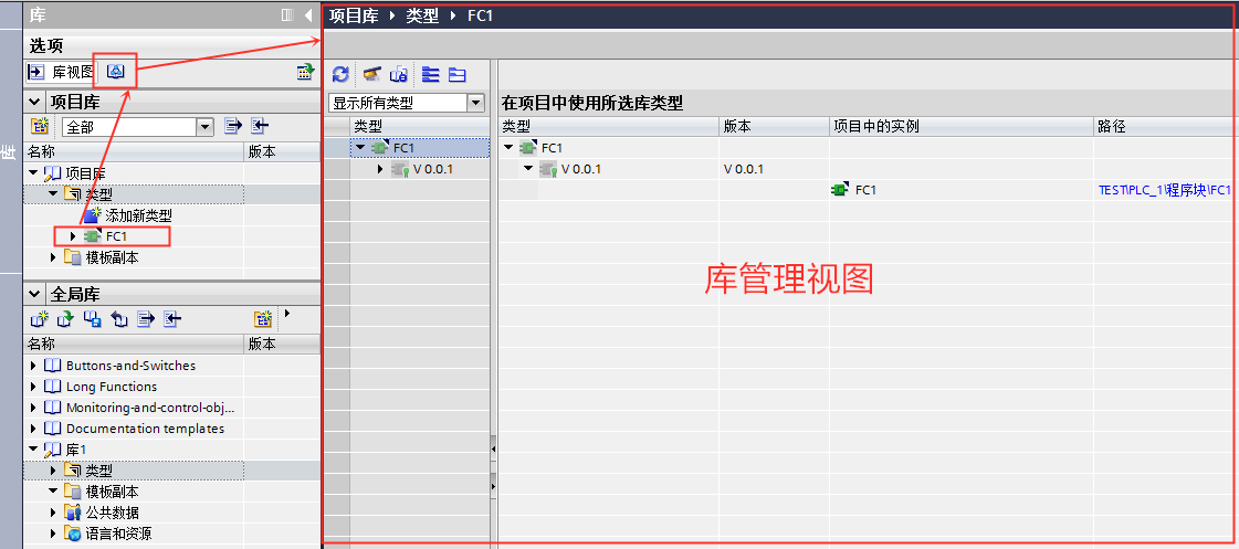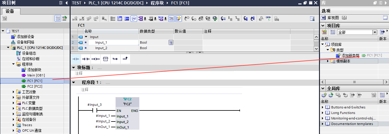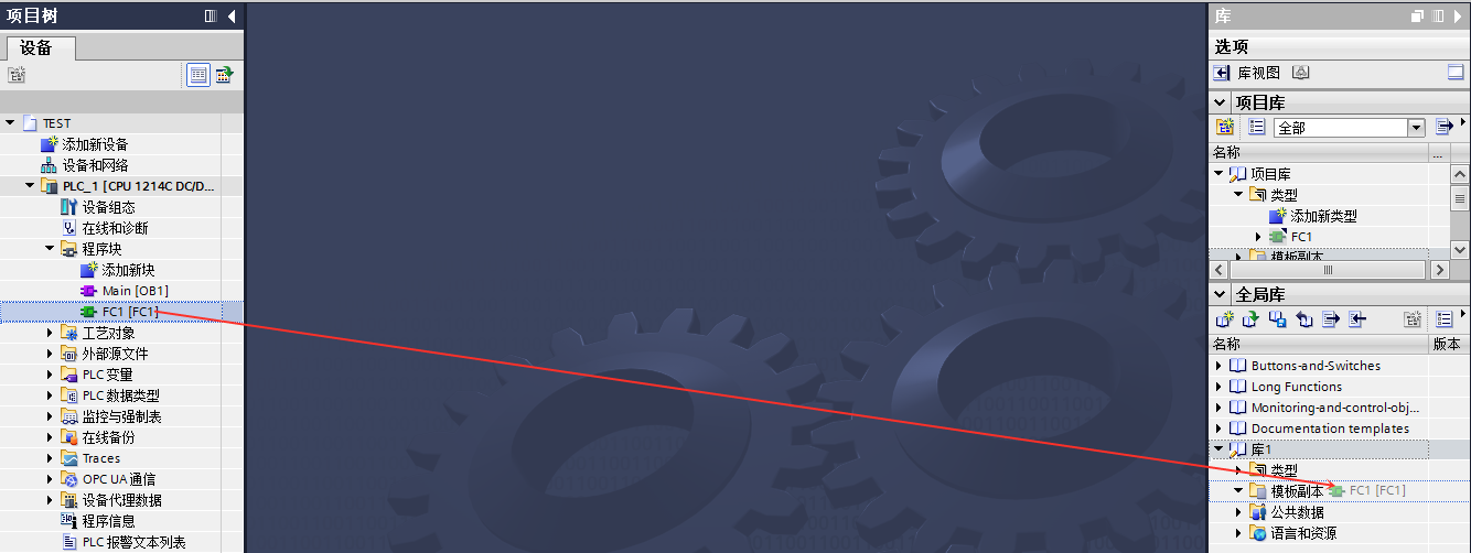 通过拖放的方式在库的类型或模板副本中添加元素,在”TEST“项目中添加新 PLC,创建 FC1,将其拖入全局库“库1”的模板副本,如图 4 所示。