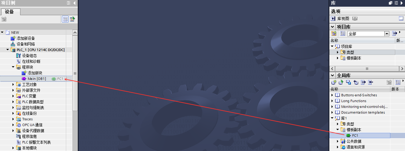 新建 PLC,将全局库“库1”模板副本中的 FC1 拖入 PLC 程序,如图 8 所示。