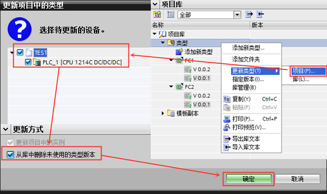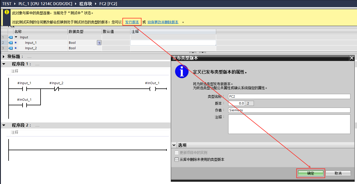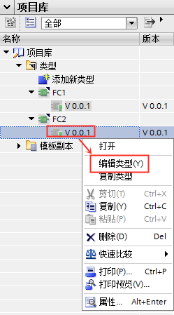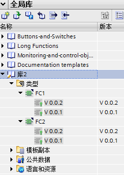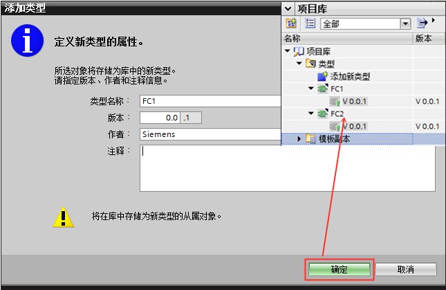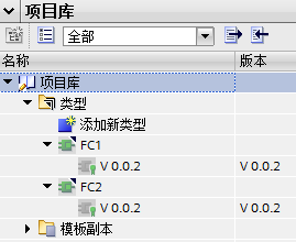 拖入项目库类型后自动提示添加类型、版本,如图 10 所示。从图中可见,当将 FC1 拖入项目库类型后,FC1 中调用的 FC2 也同时出现在项目库类型中。