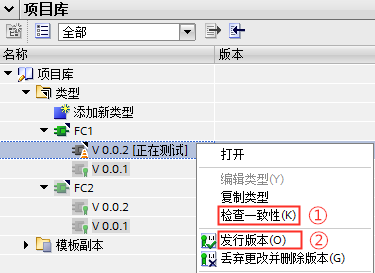 因为 FC2 的变化,导致调用该 FC2 的 FC1 变为“正在测试”模式,因此需要该 FC 检查一致性后,发行新版本。右键点击“V 0.0.2[正在测试]”,如图 14 所示。