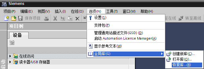 在 TIA Portal V16 之前,需要如图 20 所示,在 TIA Portal 选项菜单 > 全局库 > 恢复库选中,然后弹出如图 21 所示的窗口。