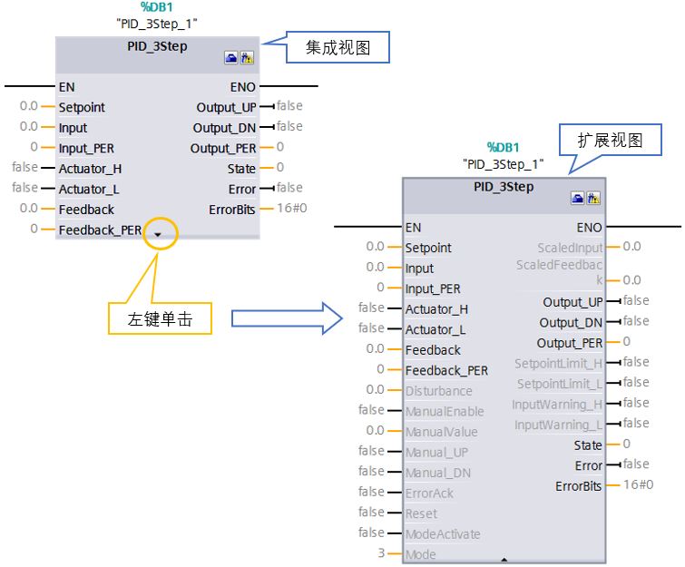 图1 PID_3Step V2 指令块的集成视图和扩展视图