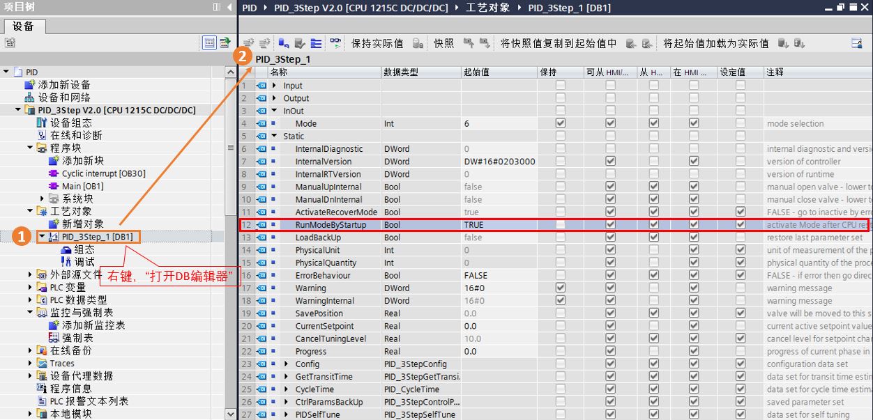 若 RunModeByStartup = TRUE,则 CPU 启动后以保存在 Mode 参数中的工作模式启动。若 RunModeByStartup = FALSE,则CPU 启动后仍保持“未激活”模式下。 RunModeByStartup为PID_3Step 背景 DB 块内静态变量,默认值为TRUE,变量在 DB 块内具体位置,如图2 所示。