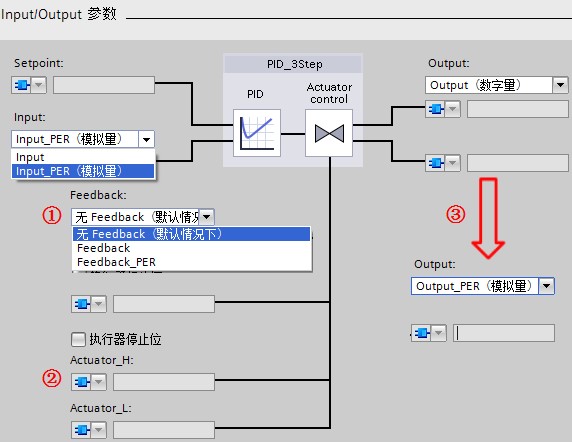 当选择输出类型为Output_PER,则PID_3Step 的输出限制将被激活,与 PID_Compact V2 一致,详细可见 S7-1200 PID Compact V2 组态步骤 章节。