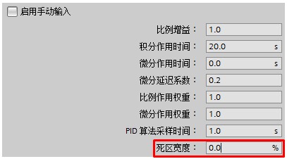 PID参数与 PID_Compact V2相比,增加了死区功能。在控制系统中,执行机构如果动作频繁,会导致小幅震荡造成机械磨损,很多控制系统允许被控量在一定范围内存在误差,该误差称为PID的死区。其大小称为死区宽度,参数如图5 所示。