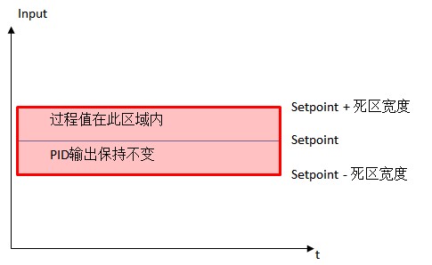 当过程值满足如下公式时,SP –"死区宽度"< PV < SP +"死区宽度"时,PID停止调节保持输出不变。如图6 所示。