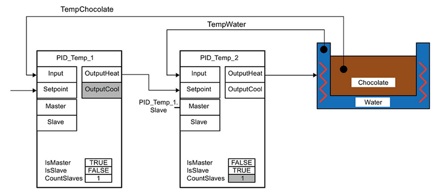 PID_Temp_1 作为主控制器将巧克力温度 (TempChocolate) 的过程值与用户在 Setpoint 参数中指定的设定值进行比较。其输出值 OutputHeat 构成从控制器 PID_Temp_2 的设定值。