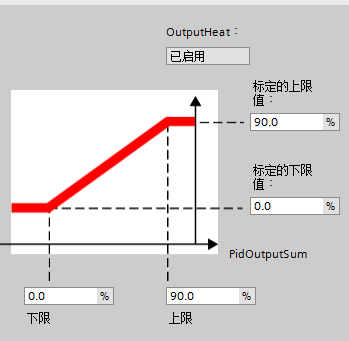 6、进入输出值限制和标定界面,这里假设从控制器的水温控制范围是 0-90℃,由于主控制器的输出值是作为从控制器的设定值,所以这里的输出值限值也是 0-90,如图 9 所示。