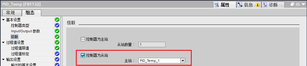 在巡视窗口里,进入级联界面,选中控制器是从站,并在主站选项里选择 PID_Temp_1,如图 12 所示。