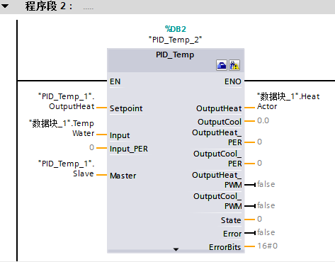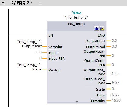 回到调用从控制器 PID_Temp 指令处,就能看到 Setpoint 和 Master 参数自动关联了 PID_Temp_1 的 OutputHeat 和 Slave 变量,如图 13 所示。