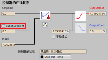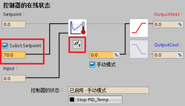 调节 PID_Temp 时要求设定值恒定。因此,激活从控制器的替代设定值以调节从控制器,或通过相应的手动值将相关主控制器设置为手动模式。这样可以确保从控制器的设定值在调节过程中保持恒定。