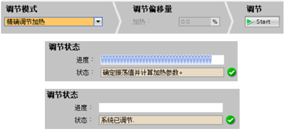 5、调节模式选择精确调节加热,点击 Start 启动调节,这时可以看到调节进度条在变化,当进度条完成时,调节状态显示系统已调节,如图 22 所示。