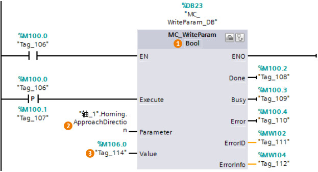 上图以回原点方向为例,“Parameter”管脚输入:<轴名称>.Homing.ApproachDirection,由于该轴的名称为“轴_1”,所以例子中的地址就是:“轴_1“.Homing.ApproachDirection。该变量是Bool类型的变量,因此在“Value”管脚中输入一个Bool类型的变量地址,同时指令的参数类型也是Bool。