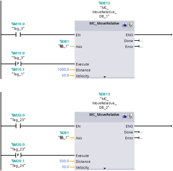 用两个MC_MoveRelative为例进行说明,如下图所示,除了在程序里调用了MC_Power指令和MC_Reset之外,还调用了两个MC_MoveRelative指令。第一个MC_MoveRelative指令的Distance = 1000.0mm,Velocity = 50.0mm/s;第二个MC_MoveRelative指令的Distance = 500.0mm,Velocity = 30.0mm/s。