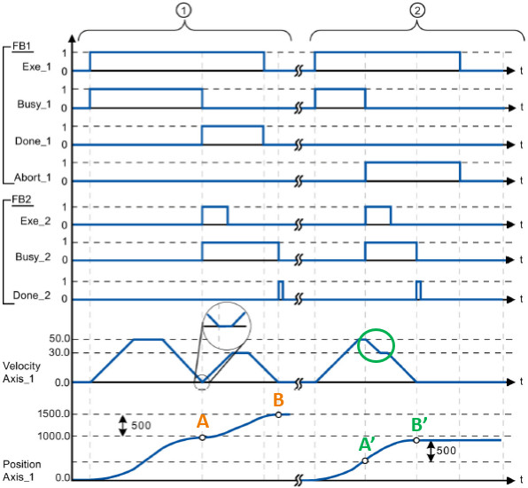 如下图所示,情况①时,第一个MC_MoveRelative指令让轴移动到了A点,触发第二个MC_MoveRelative指令后,轴在A点的基础上以30.0mm/s的速度移动了500.0mm的距离。情况②,在第一个MC_MoveRelative指令执行过程中立即触发了第二个MC_MoveRelative指令,轴从A'点的位置立即以二个MC_MoveRelative指令的参数运行,轴从当前的50.0mm/s的速度以减速度降到30.0mm/s,在A'的基础上运行了500.0mm的距离达到B'点。