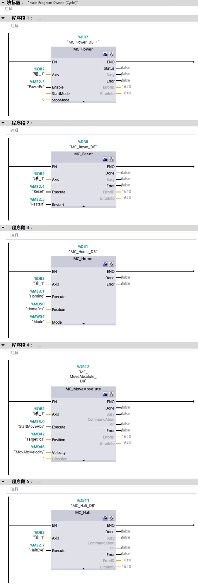 绝对运动功能需要MC_Power,MC_Reset,MC_Home,MC_MoveAbsolute和MC_Halt指令。