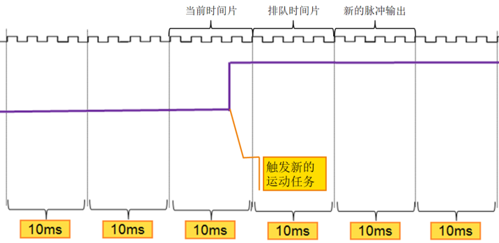 答: S7-1200默认以10ms为“时间片”计算运动任务,如下图所示,执行一个时间片时,下一时间片会在队列中等待执行。如果执行轴的新运动任务(例如通过MC_MoveVelocity”实现速度控制时,更新速度值),新运动任务可能最多等待20ms(当前时间片的剩余时间加上排队的时间片)后才执行生效。使用“MC_Halt”运动控制指令停止轴以及利用“ MC_Power”指令的“Enable”输入引脚停止轴时,也要遵循时间片机制,轴停止也会延时1-2时间片(10-20ms)才生效。
