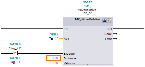 将 MC_MoveRelative 指令中的“Distance”设置成负值就可以让轴向负方向运行了。如图 1 所示。