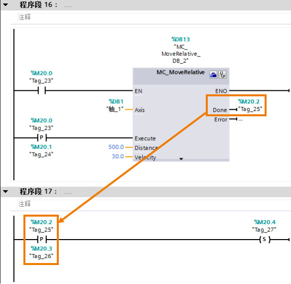 如果"Execute"在命令执行完成之前设置为 FALSE,则"Done"的值仅在一个执行周期内为 TRUE。因此,如果用户用|P|指令触发带有“Execute”管脚的指令,则该指令的“Done”只在一个扫描周期内为 1,因此在监控程序时看不到 Done 位为 1。用户可以通过在程序中添加指令用 Done 置位一个位来判断,如图 3 所示,用 MC_MoveRelative 为例进行说明。