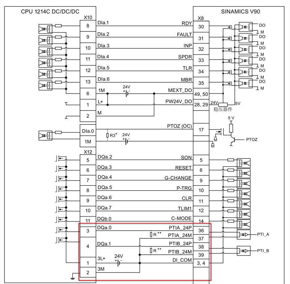 S7-1200 PTO 方式控制 V90 PTI 定位换向时,换向信号由高电平转换为低电平状态的时间取决于外围电路的输入电阻和电容,如果方向输出点的负载电流过小(应不小于 10%),在高速时输出信号波形会发生畸变,换向切换时间过长,导致换向过程中的脉冲丢失。为确保换向时不丢失脉冲,同时保证脉冲输出信号波形不发生畸变,建议在 V90 PTI 的方向控制信号 38、39 和脉冲信号 36、37 的端子间连接阻值为 200Ω 至 500Ω;,最小功率为 5W 的下拉电阻,接线如图 6 所示。