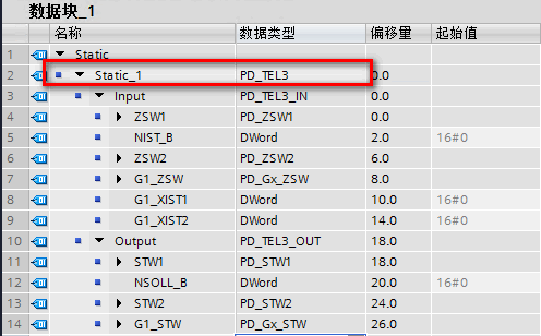 数据块由用户创建,其中需包含数据类型为"PD_TELx"的数据结构,以进行数据连接,"x"表示在设备组态中组态的驱动装置或编码器的报文编号。如图 10 所示。
