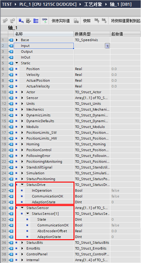 打开后,能够看到轴工艺对象以 DB 块的形式展现,然后找到如图 14 红框标识的变量,这些是后面编程需要使用的变量,这些变量在 CPU 与驱动器通信交互数据时会自动更新。