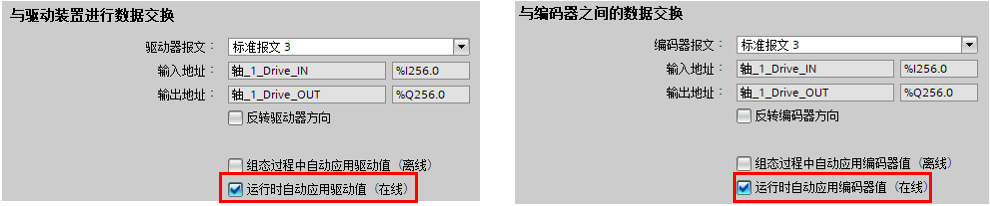 上述 ② 驱动与 ⑤ 编码器参数传递,取决于轴工艺对象组态“运行时自动应用驱动/编码器值(在线)”,如图 16 所示红框。如果需要在线传递驱动/编码器参数则激活该选项,如果无需传递则不激活。