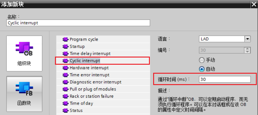 用户程序执行 USS_Port_Scan 指令的次数必须足够多,以防止驱动器超时。通常从循环中断调用 USS_Port_Scan 。 例如添加循环中断 OB30, 并设置循环中断时间 30ms。如图 2 所示: