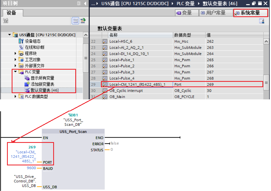 USS_Port_Scan 指令输入引脚”PORT“为分配的串口模块的“硬件标识符”。安装并组态串口模块之后,可用的端口标识符将出现在 “PORT “功能框连接的参数助手下拉列表中。或者,可在系统常量中找到该硬件标识符值。在 OB30 中调用”USS_Port_Scan“指令, 鼠标双击 CPU 1215 DC/DC/DC 站点下的 ”PLC变量>默认变量表“ , 在”系统常量“标签栏中找到本例所使用的 CM1241 RS422/485 模块,如图 3 所示。