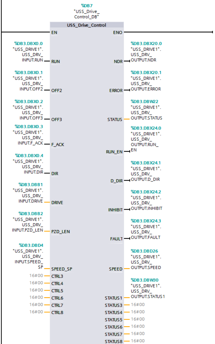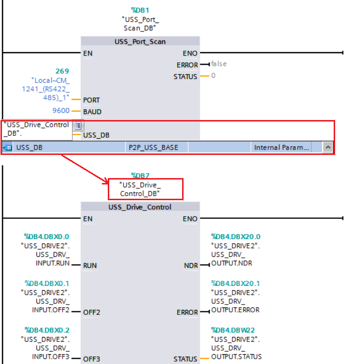 USS_Port_Scan 指令输入引脚”USS_DB“指向为 USS_Drive_Control 指令放入程序时创建并初始化的背景数据块的名称。详见常见问题"如何输入参数 USS_DB?"