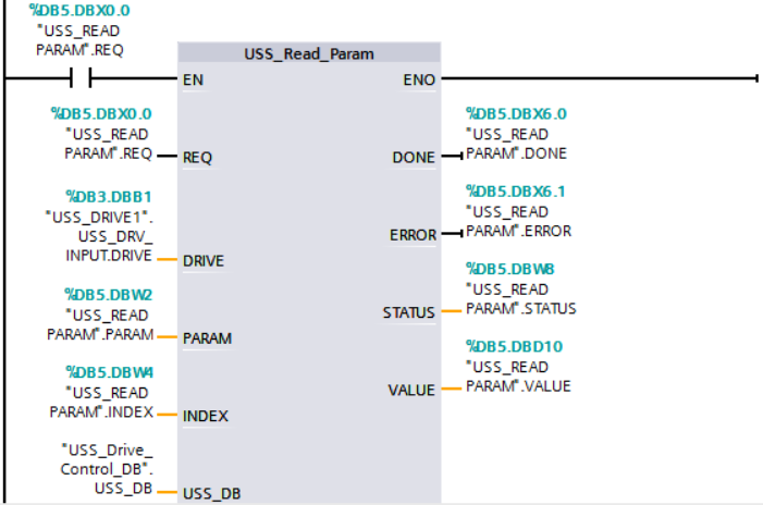 USS_Read_Param 指令用于从驱动器读取参数。必须从主程序循环 OB 调用 USS_Read_Param。