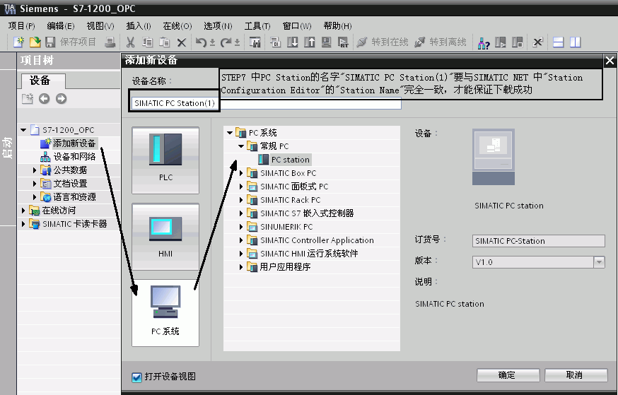 注意:TIA V11 中PC Station的名字“SIMATIC PC Station(1)”要与SIMATIC NET 中“Station Configuration Editor”的“Station Name”完全一致,才能保证下载成功。