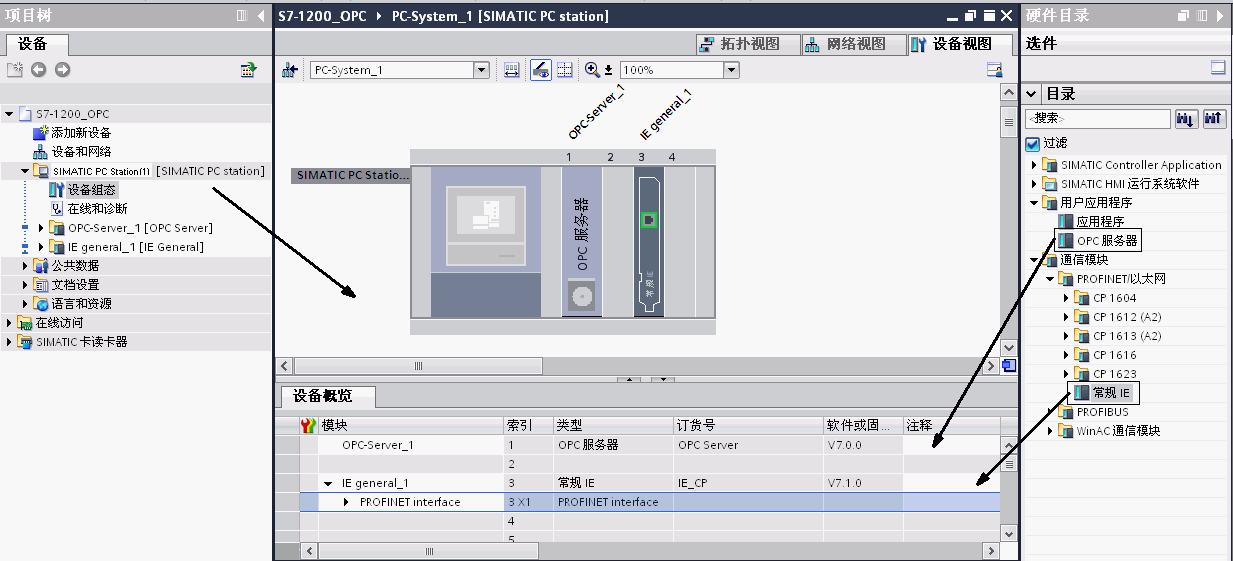 打开 TIA V11 并新建一个项目:“S7-1200_OPC”,通过“添加新设备”>“PC 系统”>“常规PC”插入一个PC站,PC站的名字为:“SIMATIC PC Station(1)”。如图1所示。