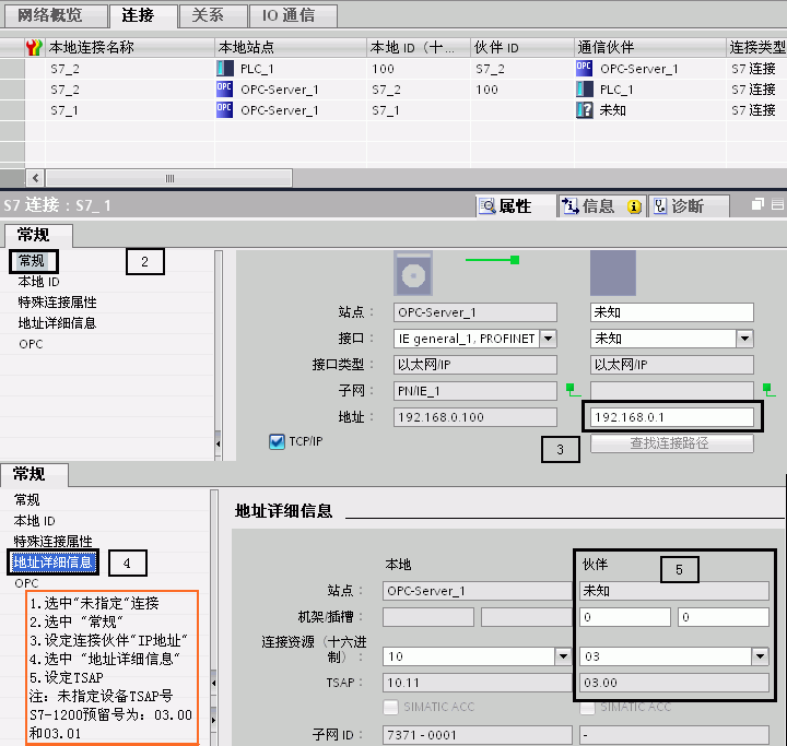 图5. 设置 S7 连接属性及TSAP地址Connection properties, TSAP