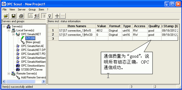 注意:如果通信质量为“bad”,则说明通信失败,需要检查软件组态及硬件连接是否正确。