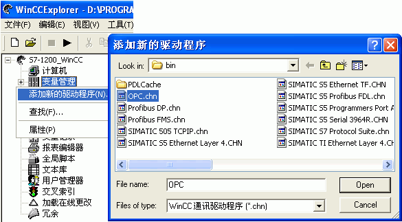打开WinCC 软件新建一个项目,用鼠标右键点击“变量管理”,在快捷菜单中点击“添加新的驱动程序”,添加新的驱动:Opc.chn。如图1所示。