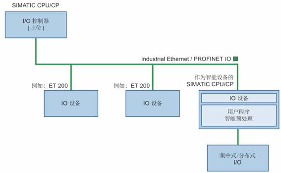 图1中作为智能设备的SIMATIC CPU/CP 不仅能处理下层分布式I/O 的数据,而且能将数据传递给上层的I/O 控制器。