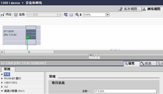 2.将该订货号直接拖到网络视图中,然后点击CPU 模块,在“属性” 〉 ”常规” 的名称中设置控制器名称。参考图4 S7-1200 设置设备名称。
