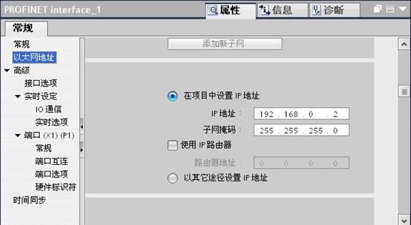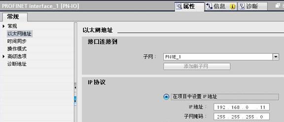 10.点击CPU 模块上的以太网口图标,然后在PROFINET 接口“属性”〉“常规”中选择“以太网地址”,在右侧选择“在项目中设置IP 地址”,然后为CPU 315 设置 IP 地址。注意要与1200 CPU 的IP 地址在同一个网段,且地址不能重复。参考图10 设置CPU 315-2PN/DP 以太网地址。