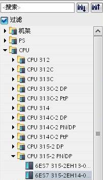 7.这样就完成了S7-1200 CPU 的硬件组态。然后需要对CPU 315-2 PN/DP 进行硬件组态。在硬件列表中选择订货号,参考图7 CPU 315 选择订货号。