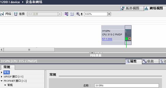 8.将该订货号拖入网络视图中,然后点击CPU 模块,在“属性”〉“常规”的名称中设置智能设备名称。参考图8 CPU 315 设置设备名称。
