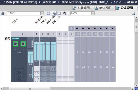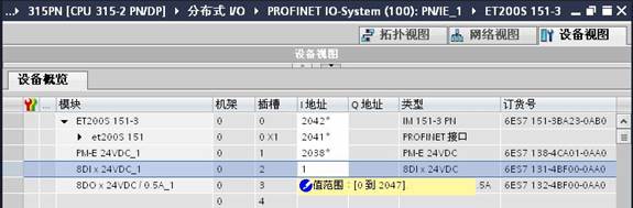 16.这样在设备视图中可以看到IM151-3 占用 CPU 315-2PN/DP 的I/O 地址。参考图 16 IM151-3 I/O 地址。