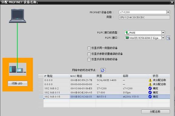 18. 在弹出的对话框中点击“分配名称”,分配设备名称可能需要几秒钟的时间,在这期间软件界面是禁止操作的。参考图18分配PROFINET设备名称。