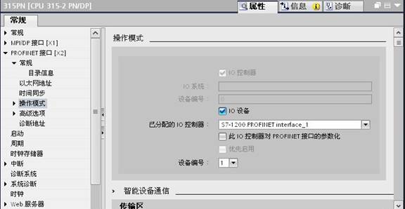 19. 这样PROFINET IO 系统 2 的配置已经完成,即 CPU 315-2PN/DP 作为智能设备与自身的IO 设备的连接已经完成。下面对PROFINET IO 系统1进行配置,需要对智能设备CPU 315-2PN/DP 分配IO 控制器 S7-1200 CPU。 进入CPU 315-2PN/DP 的设备视图,在CPU “属性”〉“常规”〉“PROFINET 接口”〉“操作模式”中钩上“IO 设备”,并选择已分配的控制器“S7-1200 PROFINET interface_1”。参考图19定义I device 的控制器。
