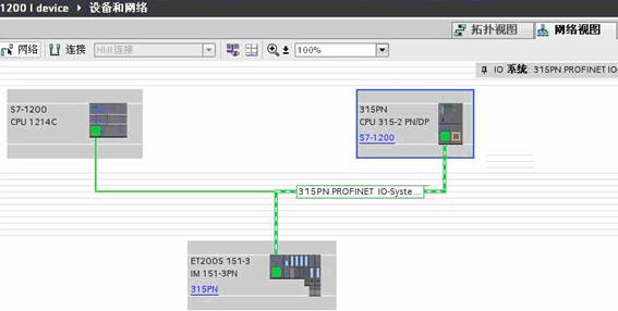 IO控制器 CPU1214C V2.1连接SCALANCE 414-3E交换机和一个IO设备 CPU315-2 PN/DP V3.2构成一个PROFINET IO系统 1。IO设备CPU315-2PN/DP V3.2同时作为PROFINET IO系统 2 的IO控制器连接一台IO设备ET200S IM151-3PN (6ES7 151-3BA23-0AB0) V7.0。CPU315-2 PN/DP就是这个系统中的智能设备。