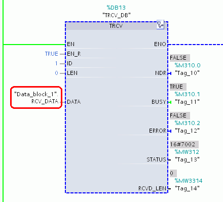 接收方的程序如图所示,“LEN”参数赋一个常数“0”,以便实现动态数据长度传输。注意要创建符号寻址方式的DB块